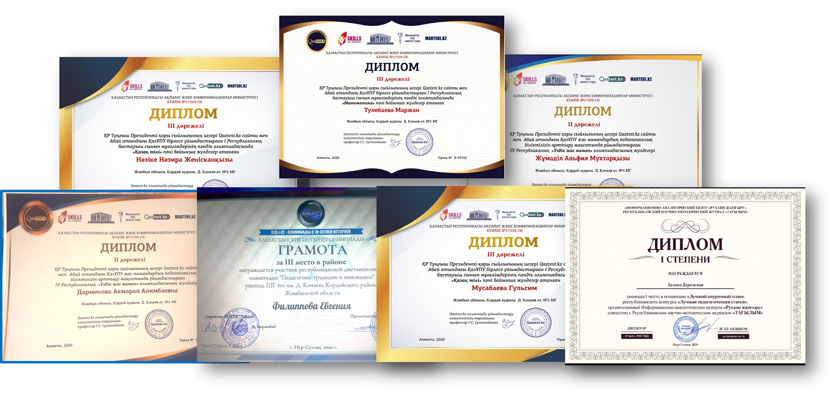 #1 Дінмұхамед Қонаев атындағы мектеп-гимназиясының бастауыш сынып мұғалімдері: Кокобаева Бибигуль Раймкуловна, Тулебаева Маржан Бахтыбековна, Нәзіке Нәзира Женісканқызы, Мусабаева Гульсим Калиевна Республикалық бастауыш сынып мұғалімдерінің пәндік олимпиадаларына қатысып I, II, III Дәрежелі дипломдармен марапатталды.