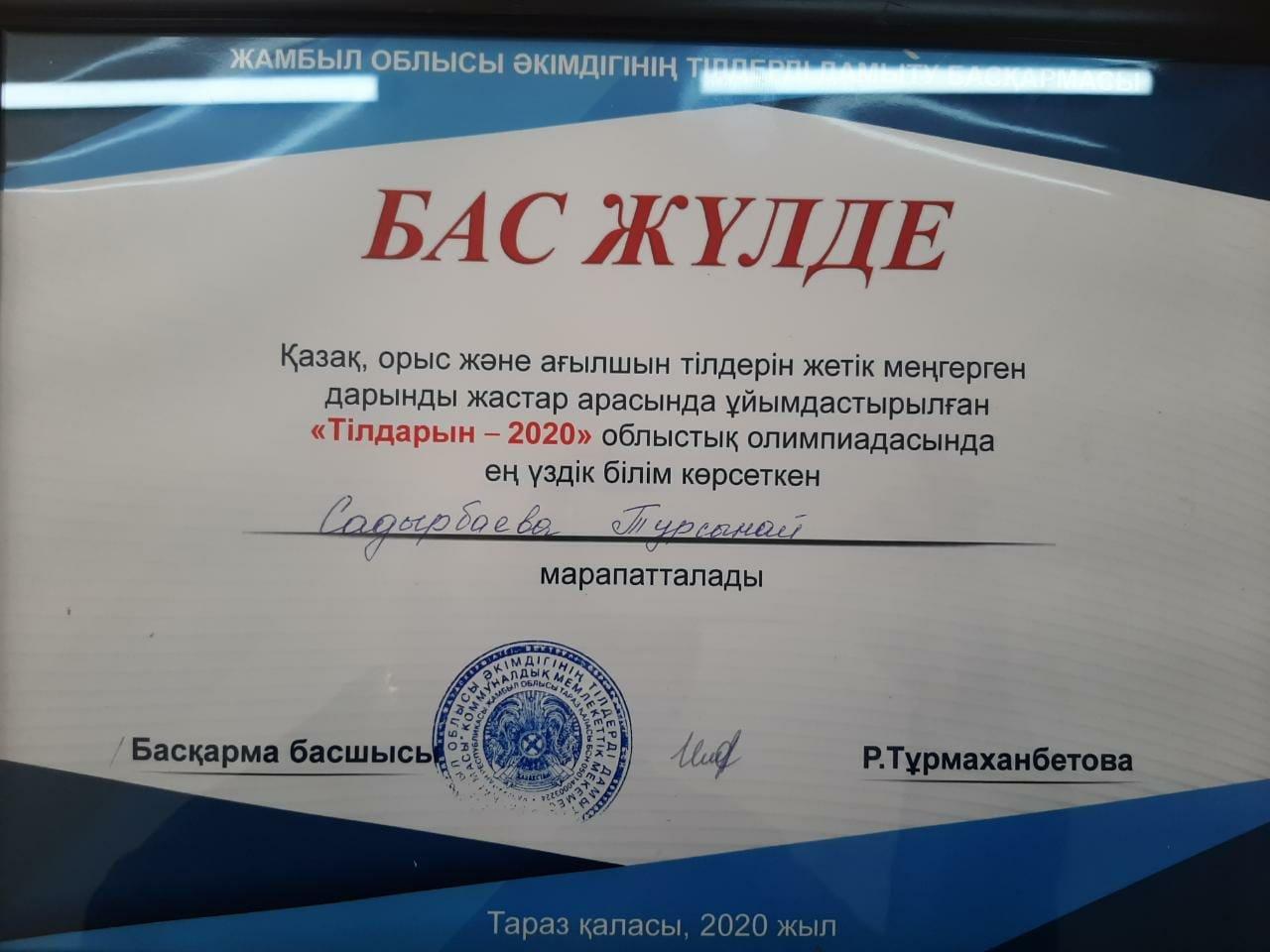 Қазақ, орыс және ағылшын тілдерін жетiк меңгерген дарынды жастар арасында ұйымдастырылған "Тiлдарын-2020" облыстық олимпиадасында ең үздік бiлiм көрсеткен №1Дiнмұхамед Қонаев атындағы мектеп-гимназиясының ағылшын тілі пәнінiң мұғалімі әрі жас маманы САДЫРБАЕВА ТУРСЫНАЙ УЗАКБАЙҚЫЗЫ бас жүлдені иеленіп, бағалы сыйлық (ноутбук) алды.