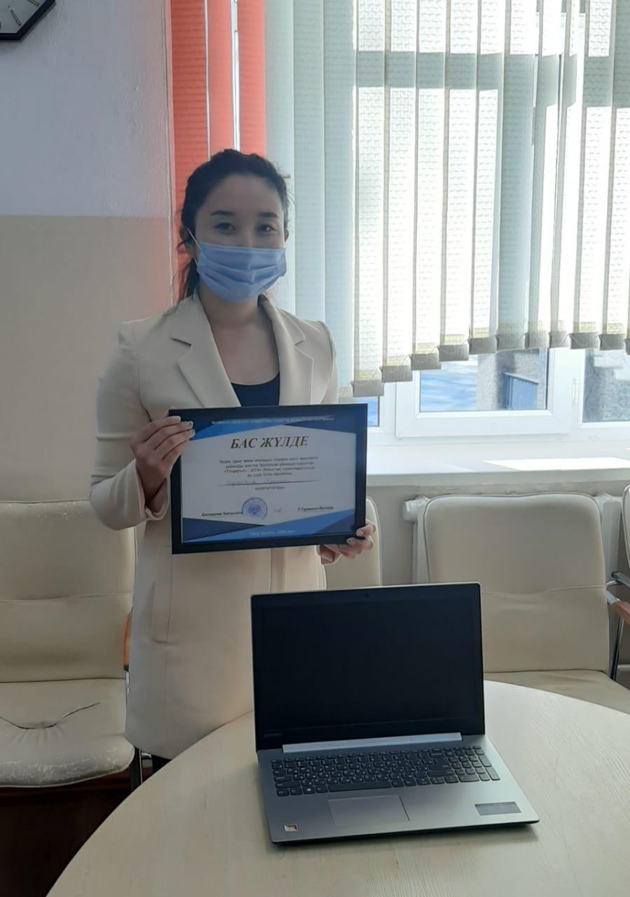 Главный приз "Ноутбук" -САДЫРБАЕВОЙ Т.У учитель английского языка школы-гимназии №1 имени Динмухамеда Конаева  молодой специалист показавшая лучшее образование на областной олимпиаде « Тілдарын 2020»