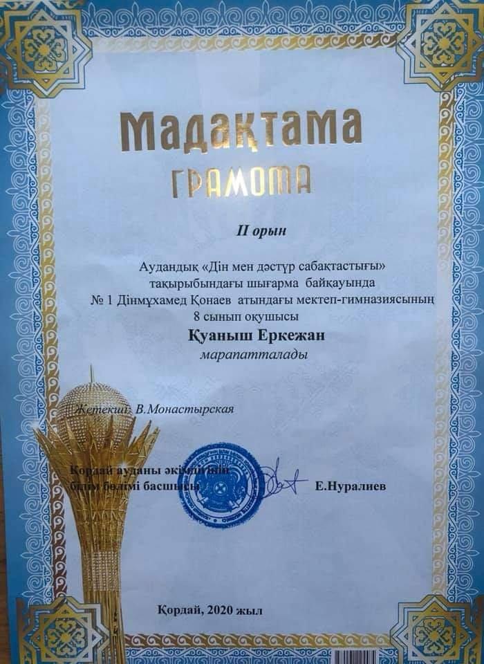 Аудандық "Дін мен дәстүрлер сабақтастығы" тақырыбындағы шығарма байқауында #1 Дінмұхамед Қонаев атындағы мектеп-гимназиясының 8 сынып оқушысы Атаков Асылхан 1 орын , Қуаныш Еркежан 2 орын.Валентин Айдана алғыс хатпен марапатталды.