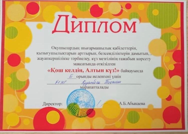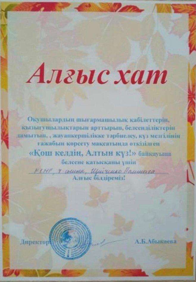 20-30 жұлдызы аралығында "Қош келдің, Алтын күз!" атты аудандық фотосурет байқауының 3-орын иегері мектебіміздің 6"ә"сынып оқушысы Қуатбек Тоғжан иеленсе 7"д"сынып оқушысы Щейченко Полина алғыс хатпен марапатталды.