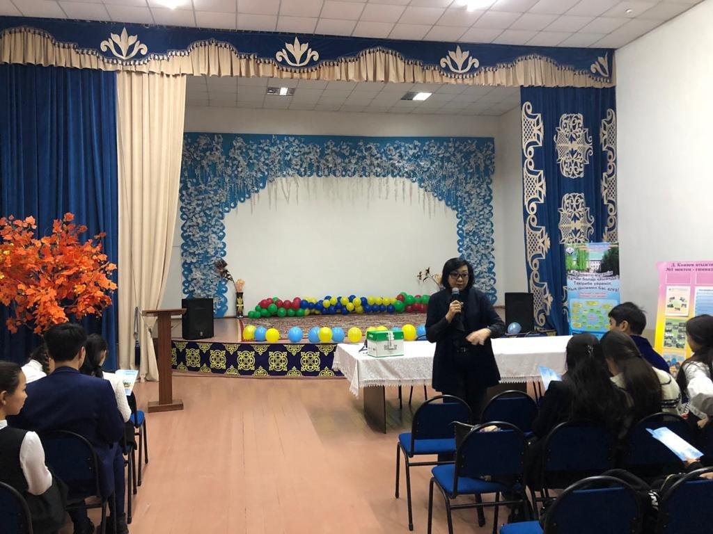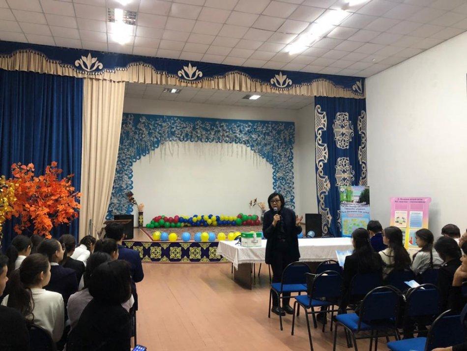 Кәсіби бағдар бойынша Алматы қаласынан Б.Барменкулова келіп, КазИТУ жайлы ондағы мамандықтар туралы үгіт насихат жүргізе отырып, оқушылардан тест жұмысын алды. Б.Барменкулова с Алматы из КазИТУ приехала по программе профориентации и побеседовала с выпускниками школы.