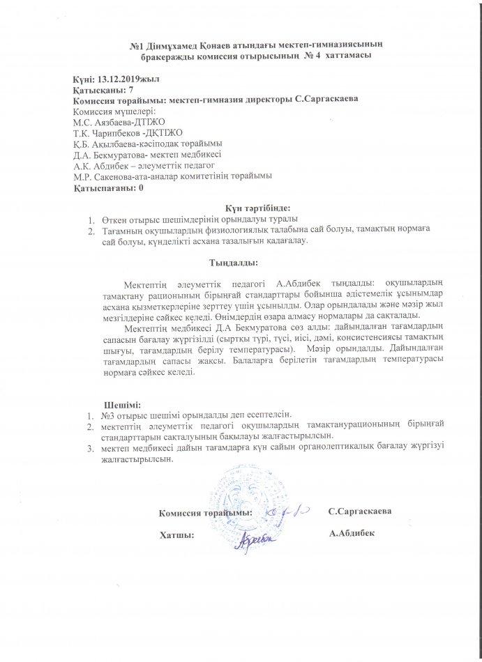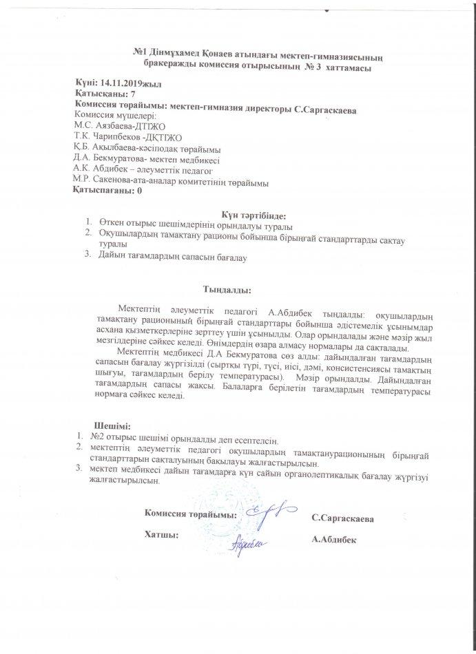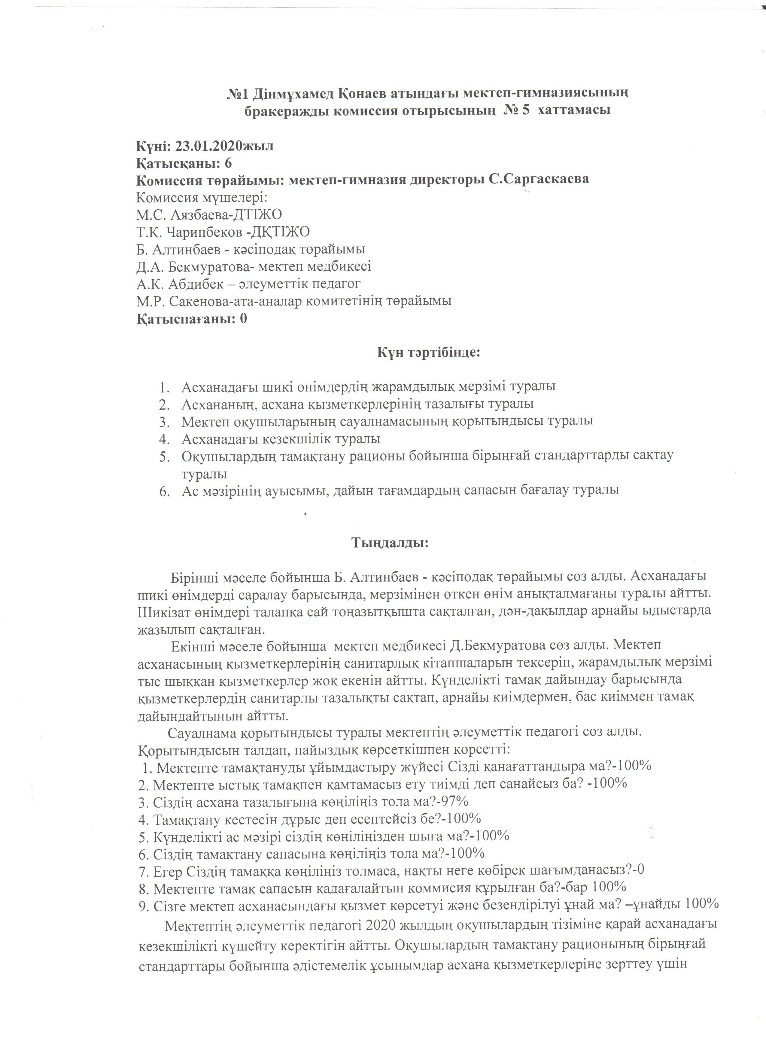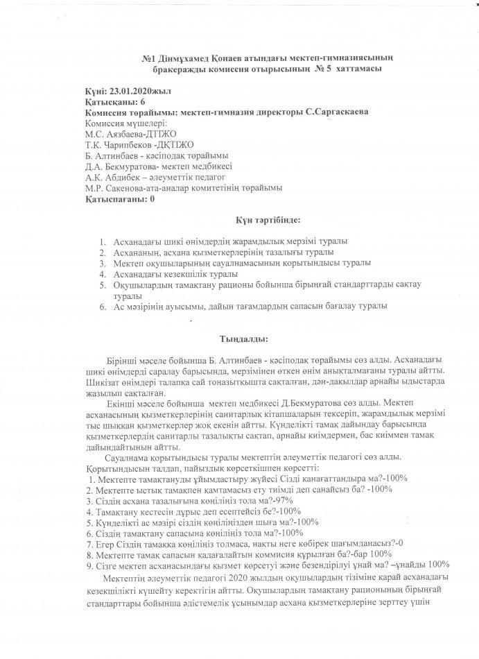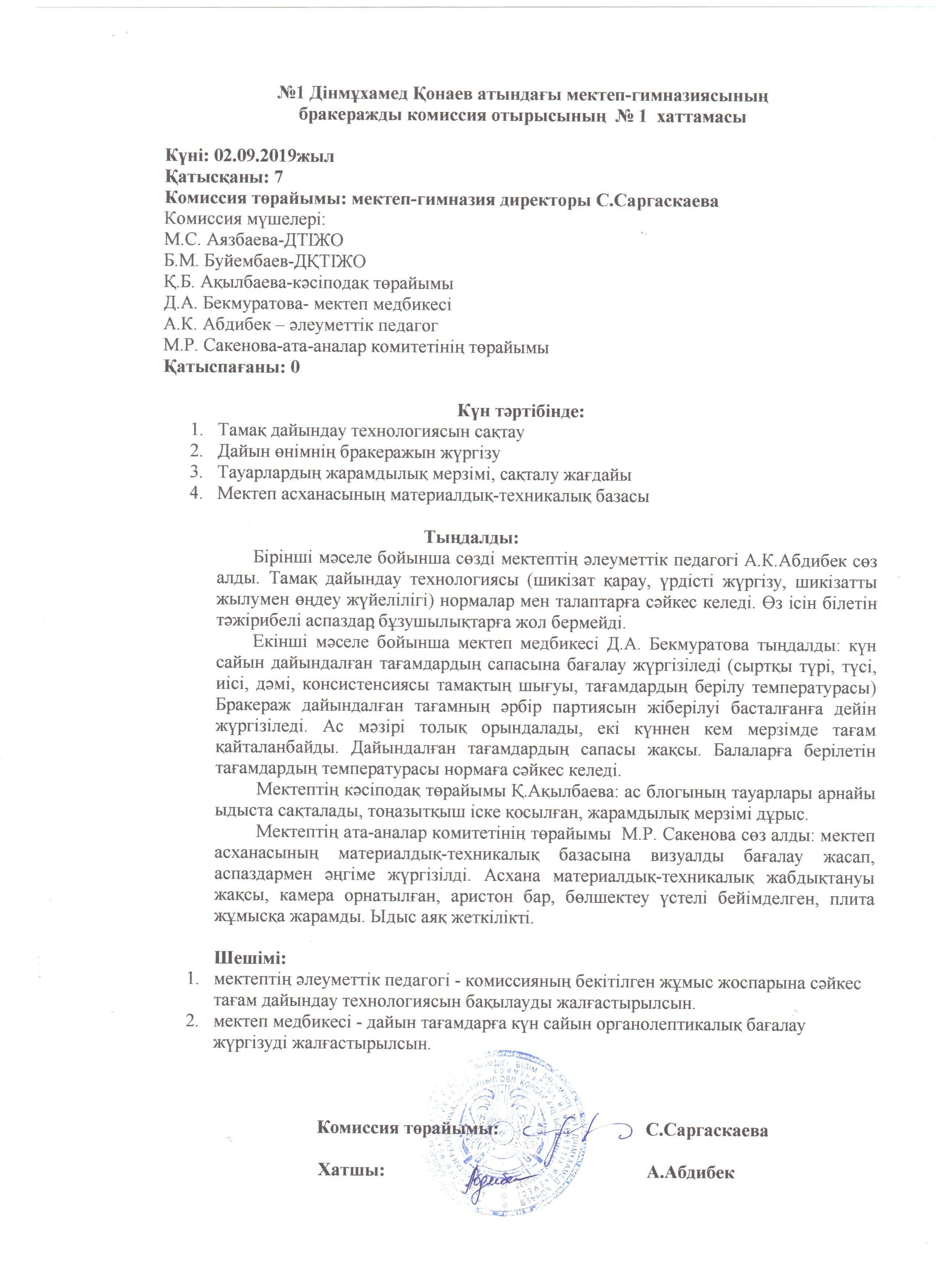 бракераждық комиссияның хаттамалары » СШ №1 им. Конаева