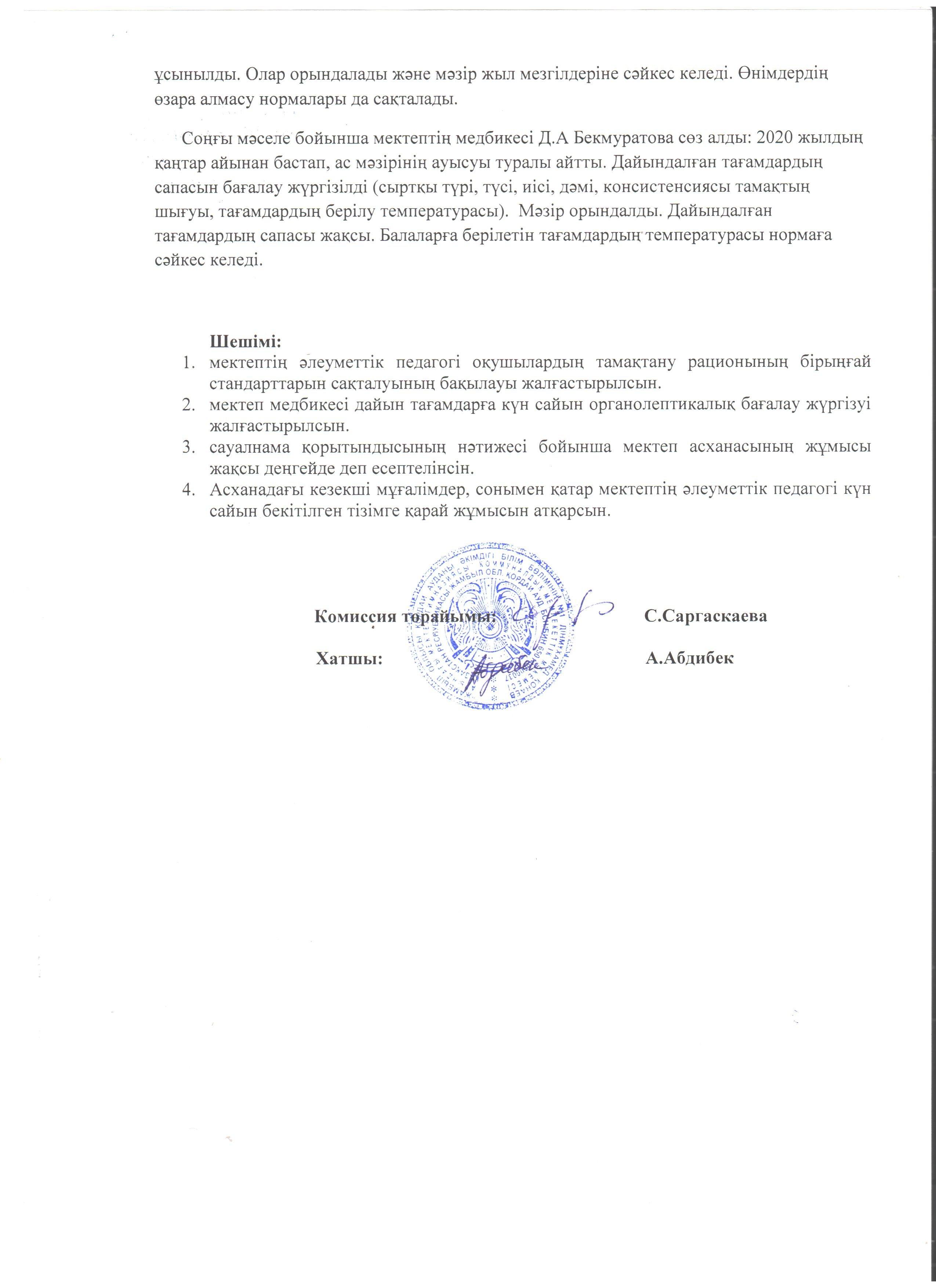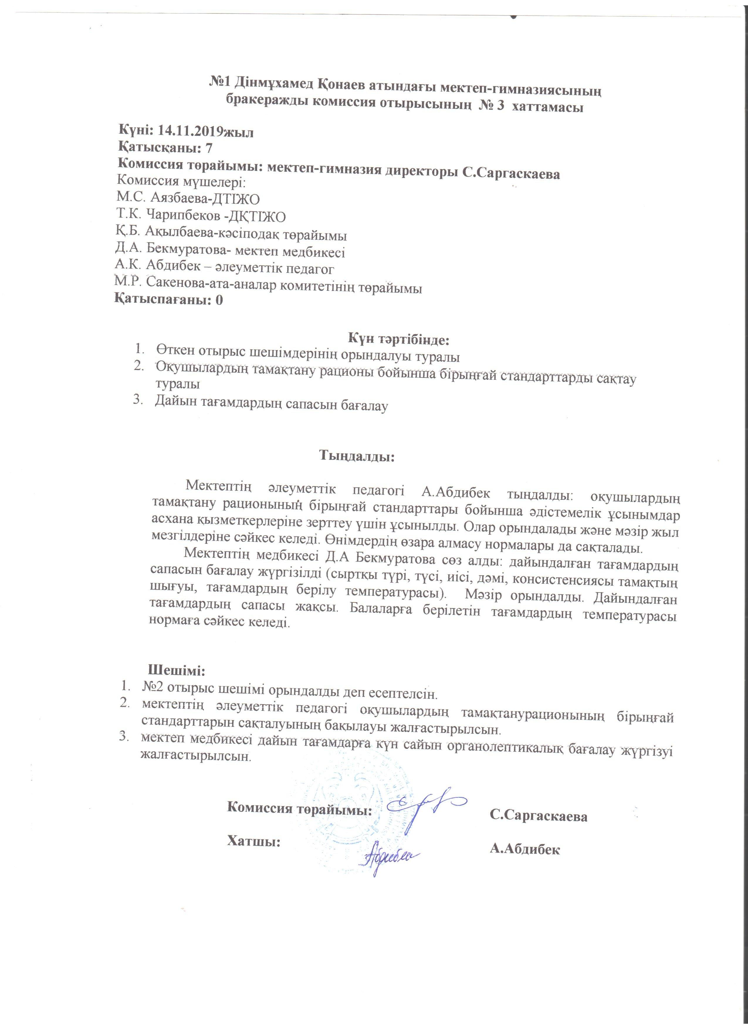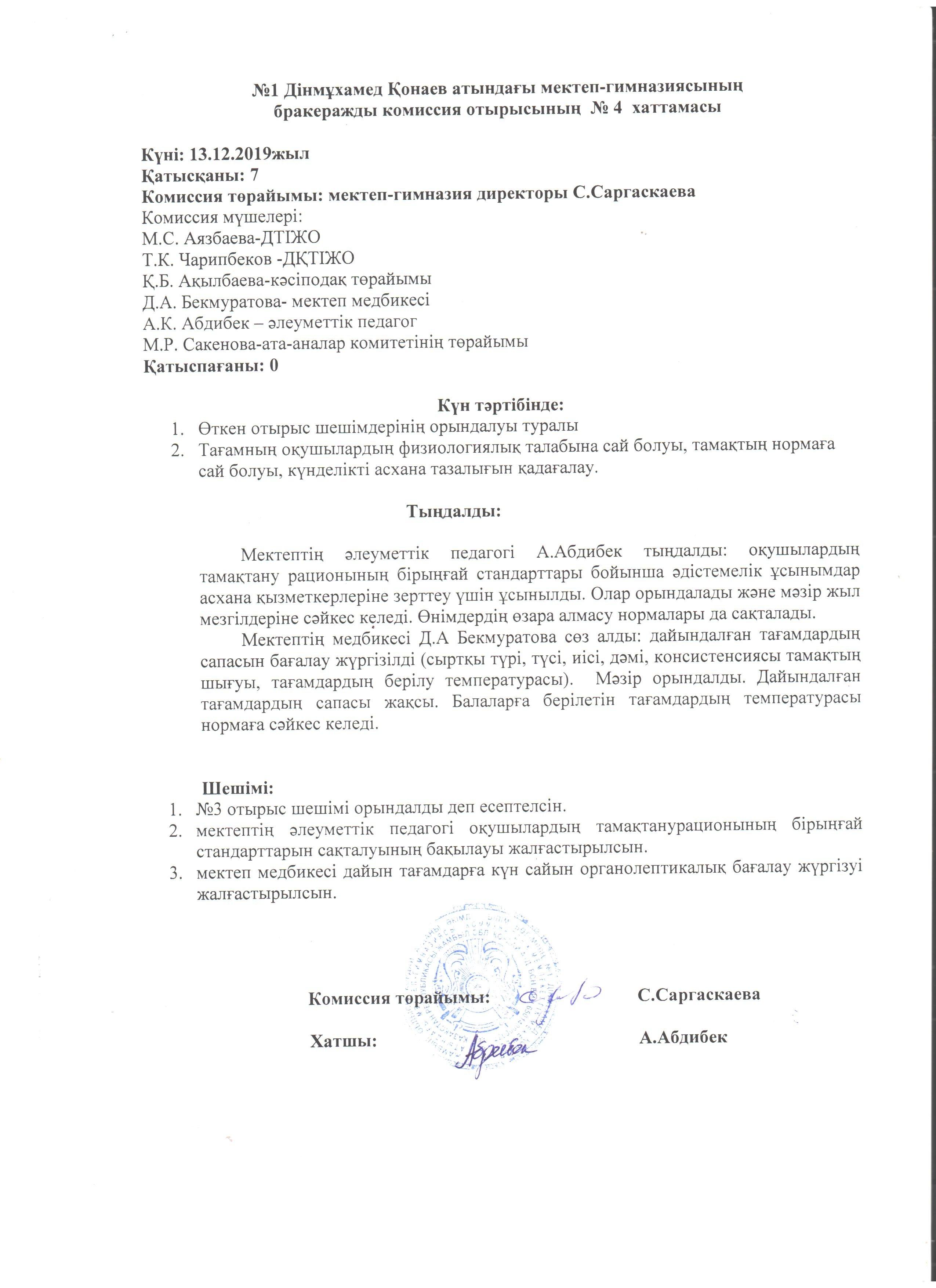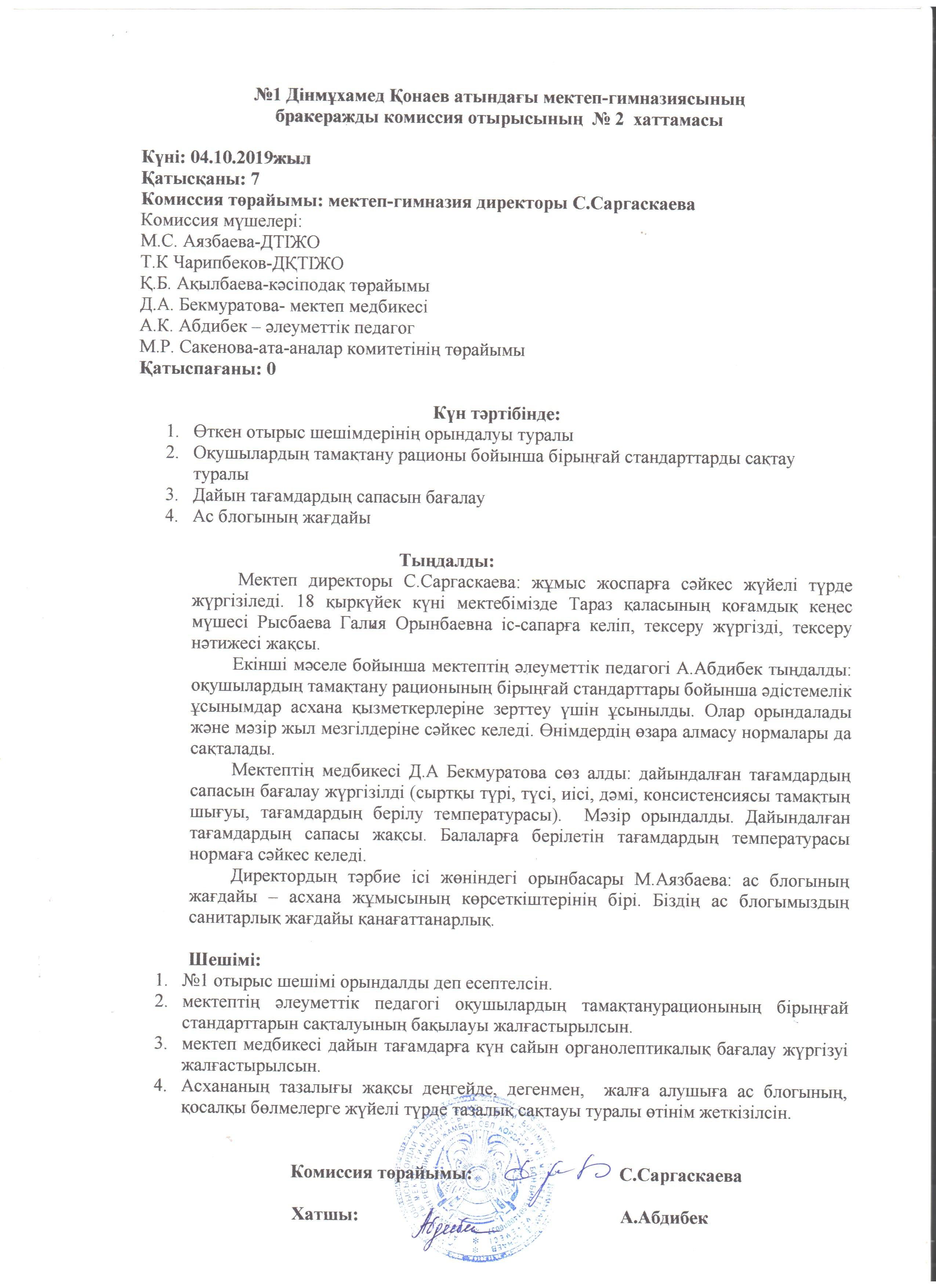 бракераждық комиссияның хаттамалары » СШ №1 им. Конаева