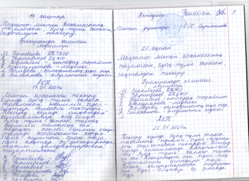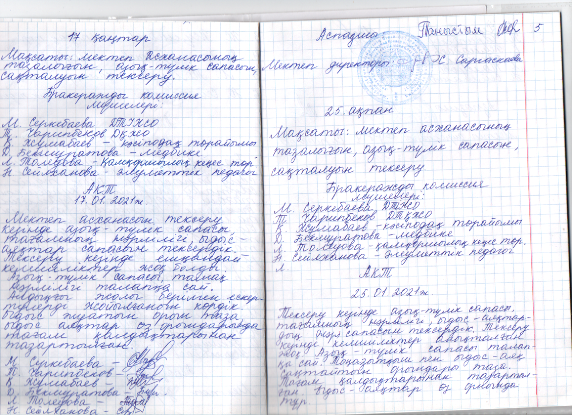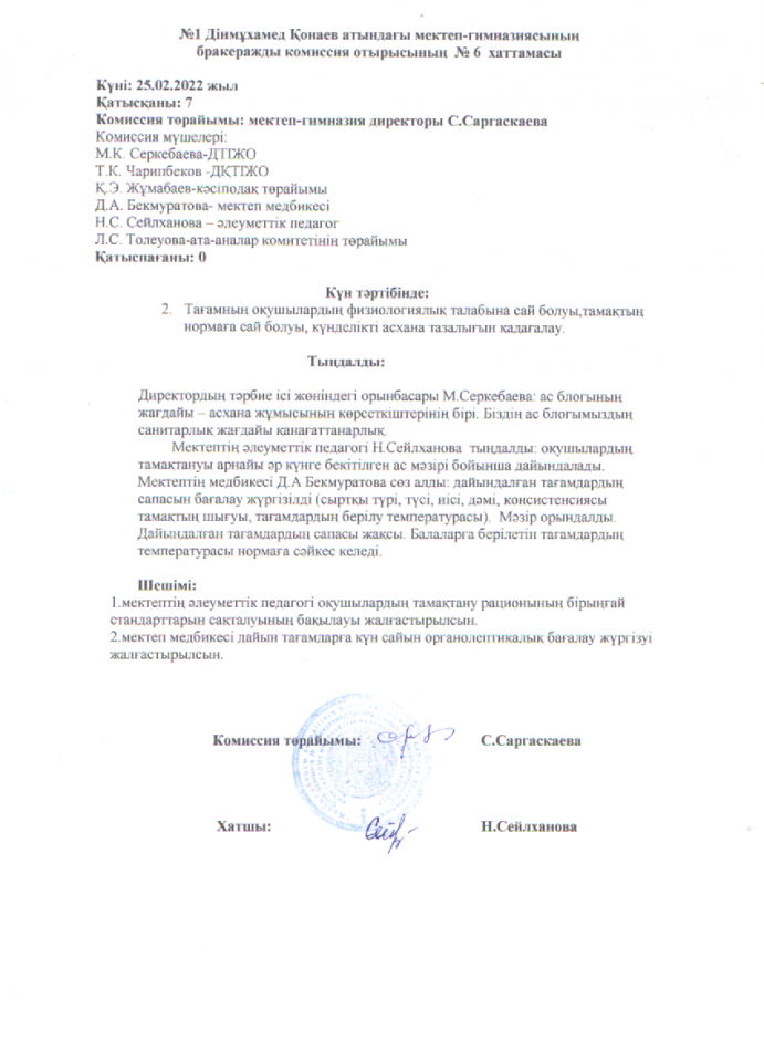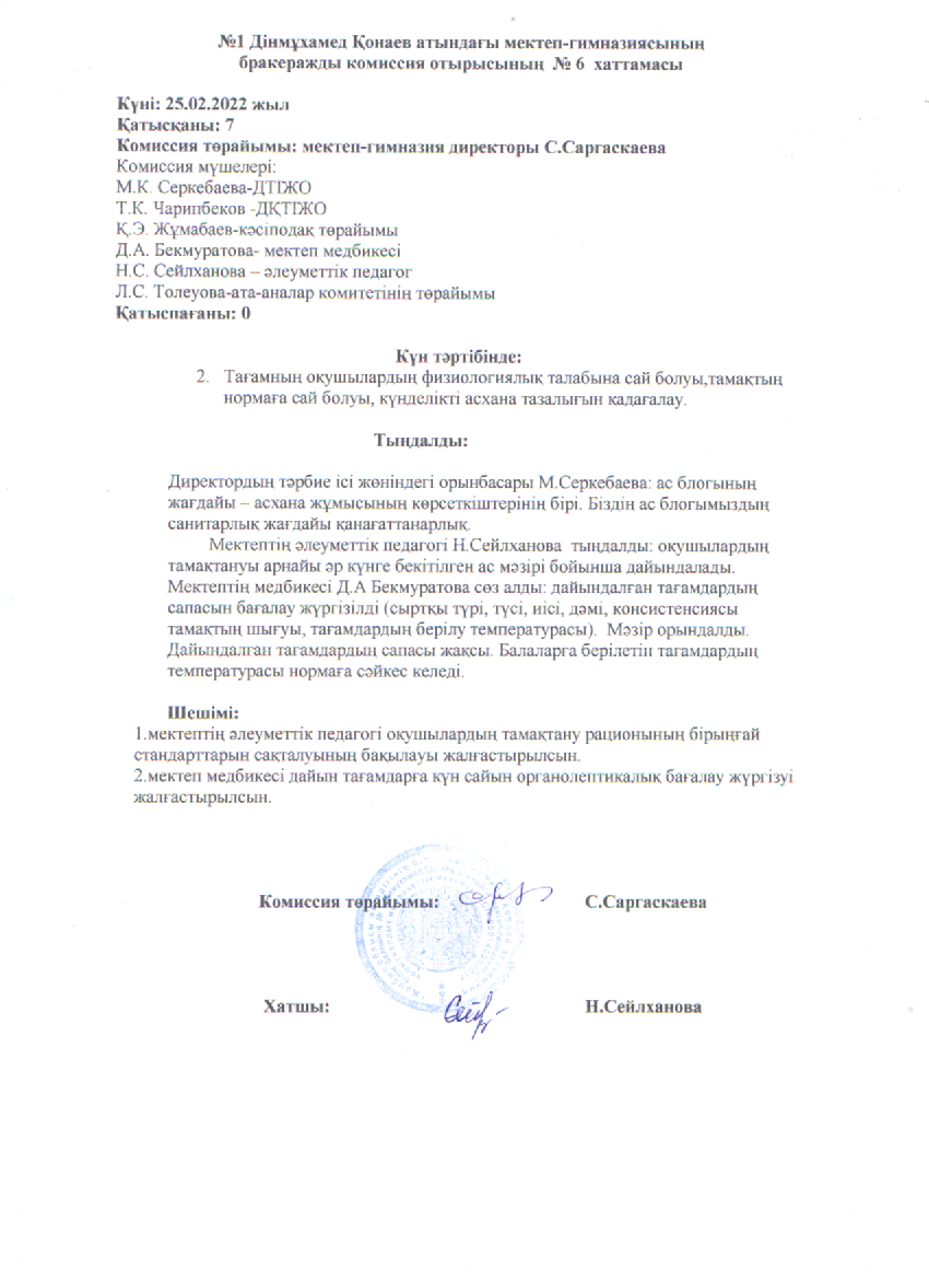 Бракеражды комиссия отырысының № 6 хаттамасы » СШ №1 им. Конаева