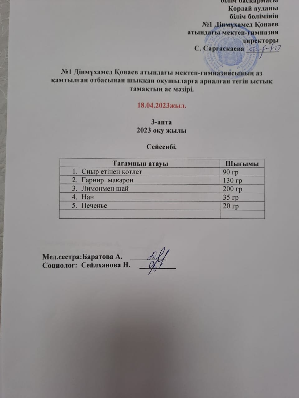 18 апрель 2023 0 1 2 3 4 5 18.04.2023 ж Асханада тегін тамақтанатын оқушылардың Сейсенбі күнгі ас мәзірі